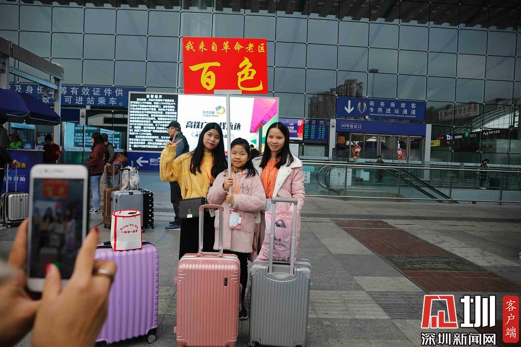深圳北站西廣場進(jìn)站口,三位搭乘本次愛心專列的乘客正在合影。