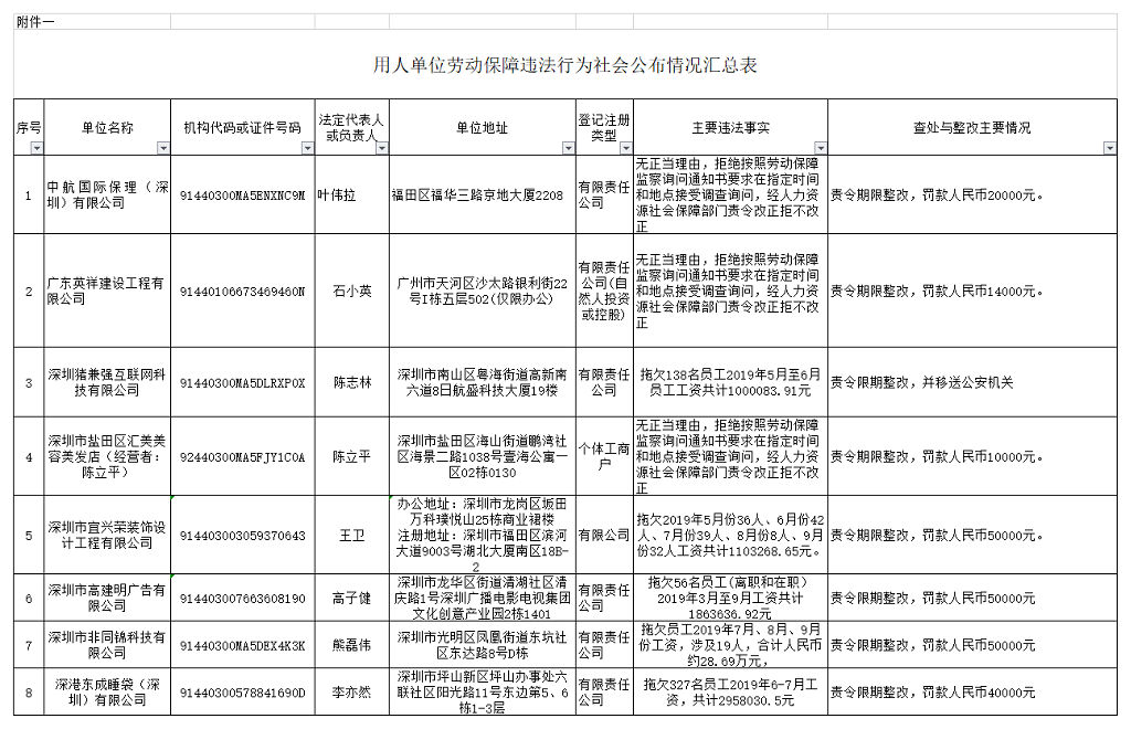 2019年第四季度,深圳市人力資源部門繼續(xù)加大對(duì)欠薪等勞動(dòng)保障違法行為的打擊力度,依法處罰,對(duì)涉嫌犯罪的堅(jiān)決移送司法機(jī)關(guān),切實(shí)維護(hù)勞動(dòng)者的合法權(quán)益。為加強(qiáng)對(duì)違法用人單位的社會(huì)監(jiān)督,強(qiáng)化誠信體系建設(shè),加大威懾力,深圳市人力資源和社會(huì)保障局依據(jù)《廣東省用人單位重大勞動(dòng)保障違法行為社會(huì)公布暫行規(guī)定》和《深圳市勞動(dòng)保障違法信息公布辦法》,日前部分區(qū)(新區(qū))人力資源部門查處的一批勞動(dòng)保障違法案件予以公布。