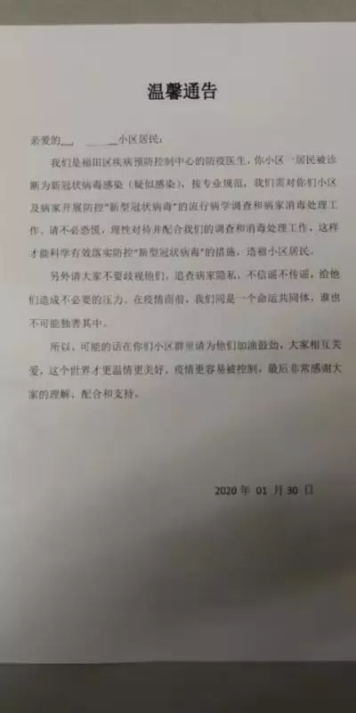 1月30日,由于深圳一小區(qū)出現(xiàn)新冠狀病毒疑似感染病例,福田區(qū)疾病預(yù)防控制中心的防疫醫(yī)生發(fā)布了這則通告。通告除了呼吁小區(qū)居民配合調(diào)查及消毒處理工作外,還特地懇請(qǐng)大家“不要歧視,在疫情面前,我們是同一個(gè)命運(yùn)共同體,誰也不可能獨(dú)善其身?!辈恢獮楹?,雖不是湖北人也未曾受過歧視,但還是被這寥寥數(shù)字的“請(qǐng)求”溫暖了。