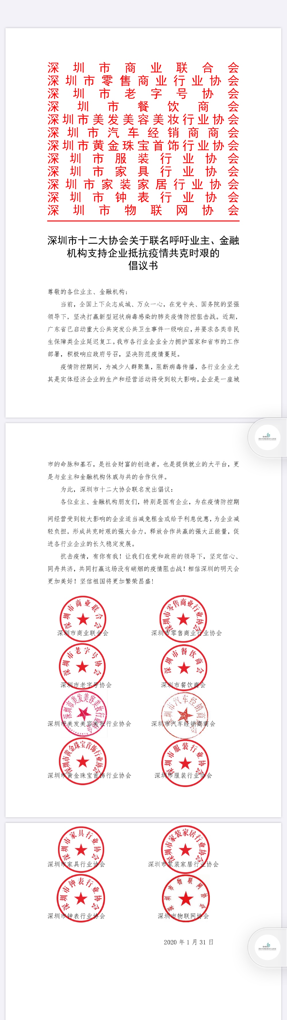見圳客戶端·深圳新聞網2020年2月1日訊(見圳客戶端、深圳新聞網記者 金洪竹)1月31日深夜,一份特別的倡議書在網絡熱傳。深圳市商業(yè)聯合會、深圳市零售商業(yè)行業(yè)協(xié)會、深圳老字號協(xié)會、深圳市餐飲商會、深圳市美發(fā)美容美妝行業(yè)協(xié)會、深圳市汽車經銷商協(xié)會、深圳市黃金珠寶首飾行業(yè)協(xié)會、深圳市服裝行業(yè)協(xié)會、深圳市家具行業(yè)協(xié)會、深圳市家裝家居行業(yè)協(xié)會、深圳市鐘表行業(yè)協(xié)會和深圳市物聯網協(xié)會等12家商協(xié)會發(fā)出聯名倡議,呼吁業(yè)主、金融機構支持企業(yè)抵抗疫情、共克時艱。