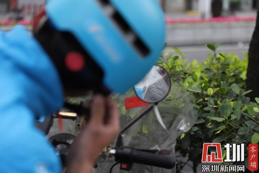 下午2點(diǎn)32分,午休過后,王彭輝用后視鏡調(diào)整戴好的頭盔,繼續(xù)送餐。