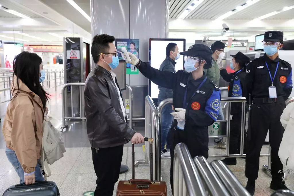 在地鐵站入口處,安檢人員測(cè)量乘客體溫。