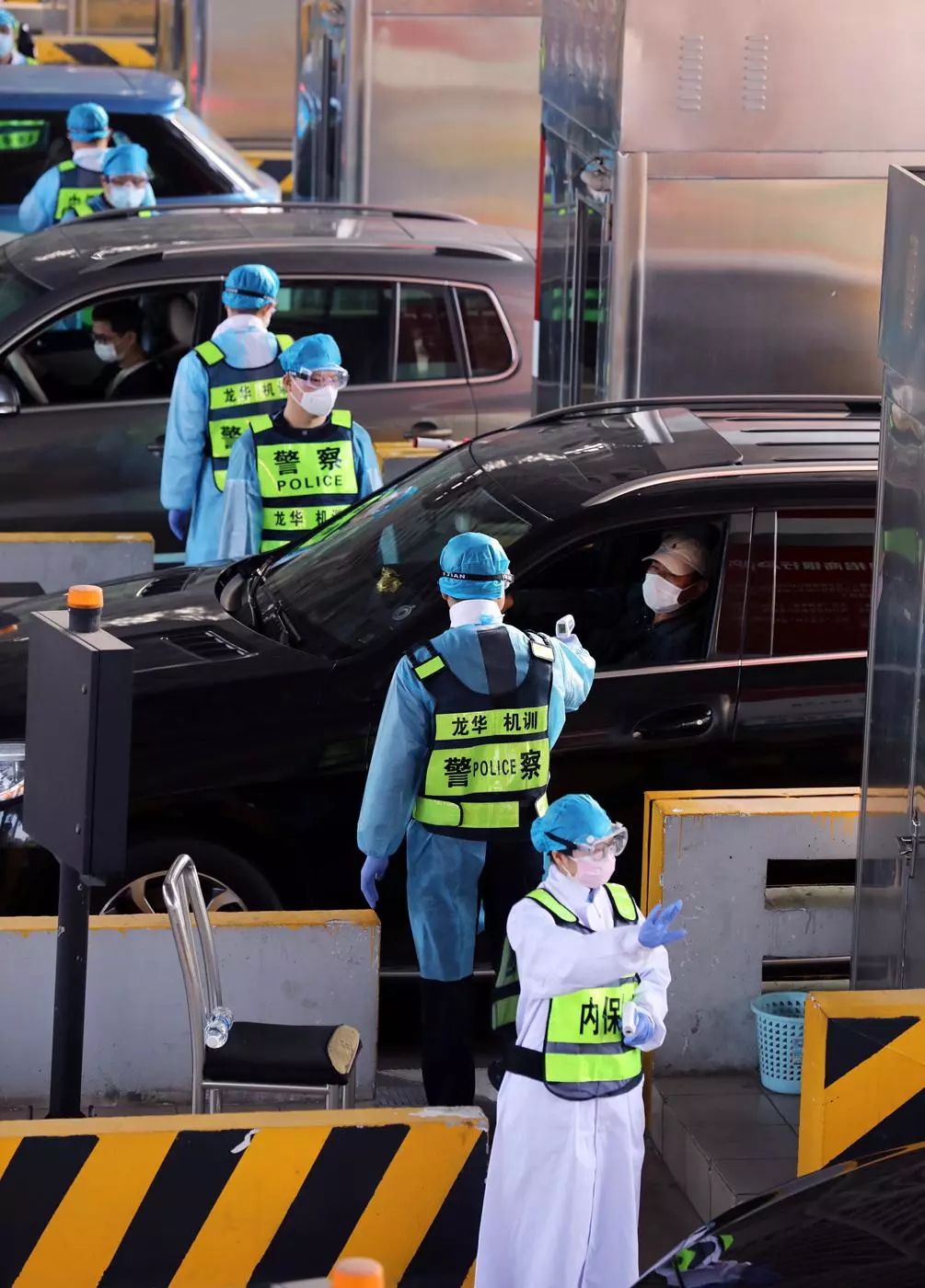 執(zhí)勤民警協(xié)助醫(yī)務人員對入深車輛上的人員進行體溫檢測。