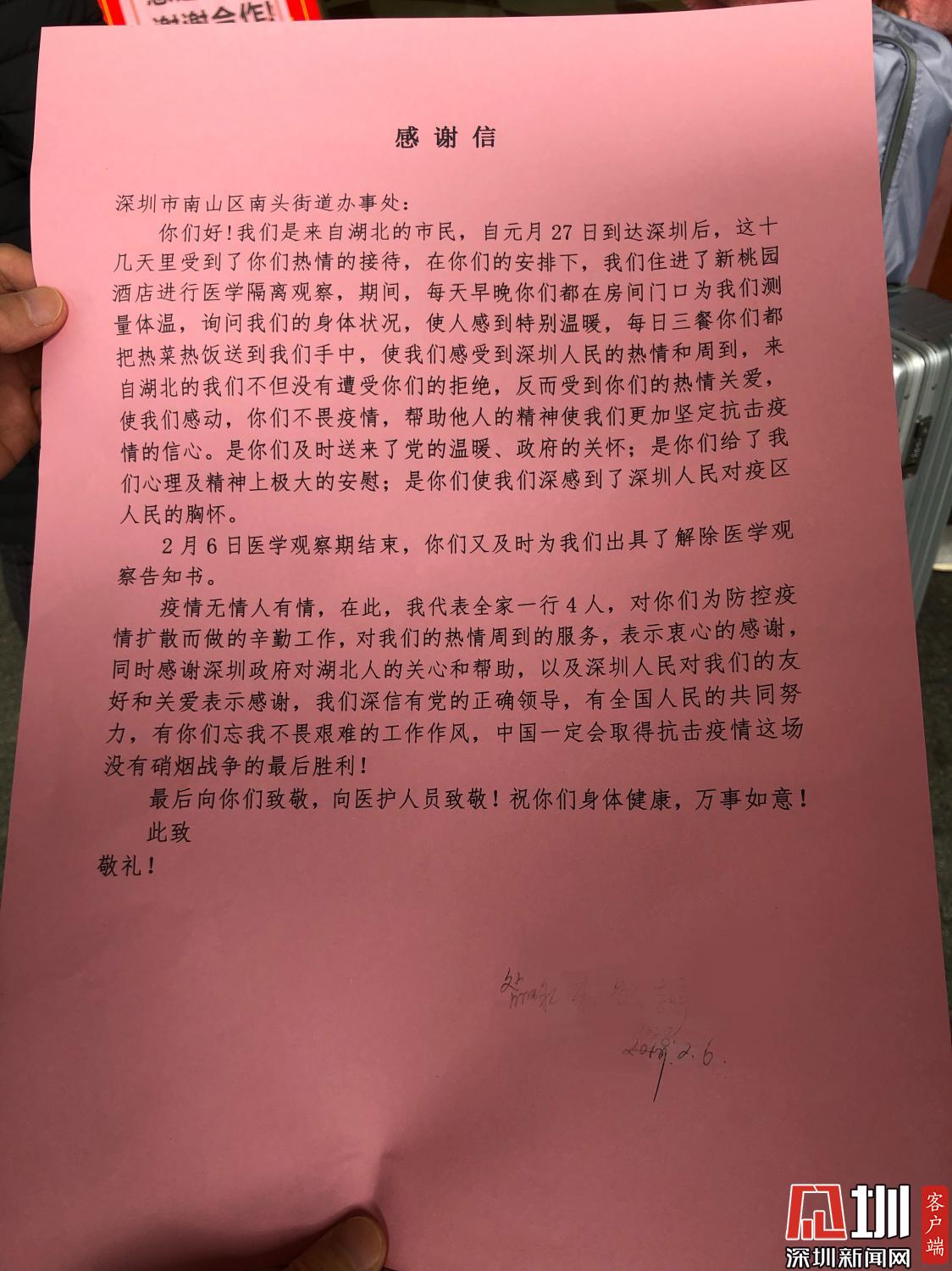 見(jiàn)圳客戶端·深圳新聞網(wǎng)訊(記者 王志明 特約記者 戴潔 通訊員 楊曉華)2月6日下午,李女士一家四口給南頭街道送上了“感謝信”和錦旗。