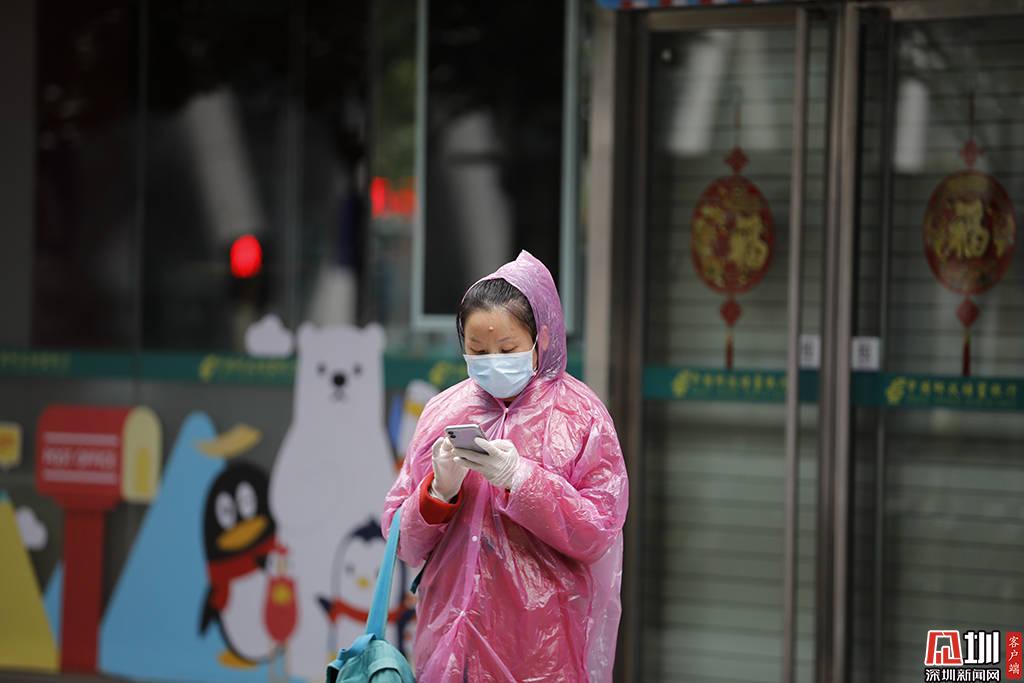 深圳軟件產(chǎn)業(yè)基地中,一位身著一次性雨衣、戴著手套和口罩的上班族。