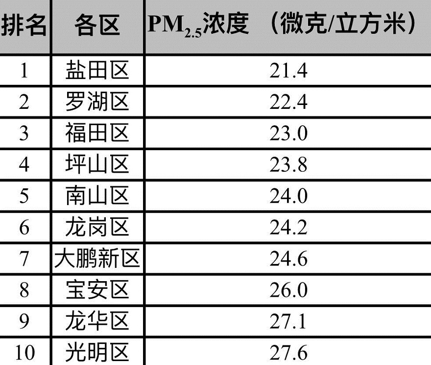 此外,各區(qū)PM2.5平均濃度在21.4-27.6微克/立方米之間,濃度較低的有鹽田、羅湖和福田,濃度較高的有光明、龍華和寶安。