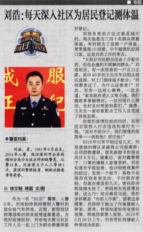作為一名“90后”警察,入警6年,劉浩始終保持著剛?cè)刖瘯r(shí)的那份銳氣和拼勁。近期,新型冠狀病毒感染的肺炎疫情逐漸蔓延。為做好疫情防控,劉浩每天都與社區(qū)工作人員一起上門為群眾測量體溫并登記。
