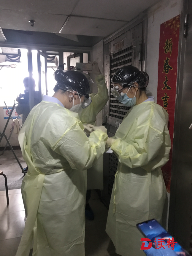 孫女士打開門,將工作人員遞進(jìn)去的防護(hù)裝備穿戴完畢?!盀榱吮Wo(hù)醫(yī)護(hù)人員的安全,減少交叉感染的可能性,所有的上門檢測(cè)都會(huì)在樓道里進(jìn)行。”社康中心工作人員說。提前穿好防隔服等防護(hù)裝備、拿檢測(cè)時(shí)給居民坐的凳子、為凳子消毒,開始進(jìn)行檢測(cè)前就需要做很細(xì)致的準(zhǔn)備工作。