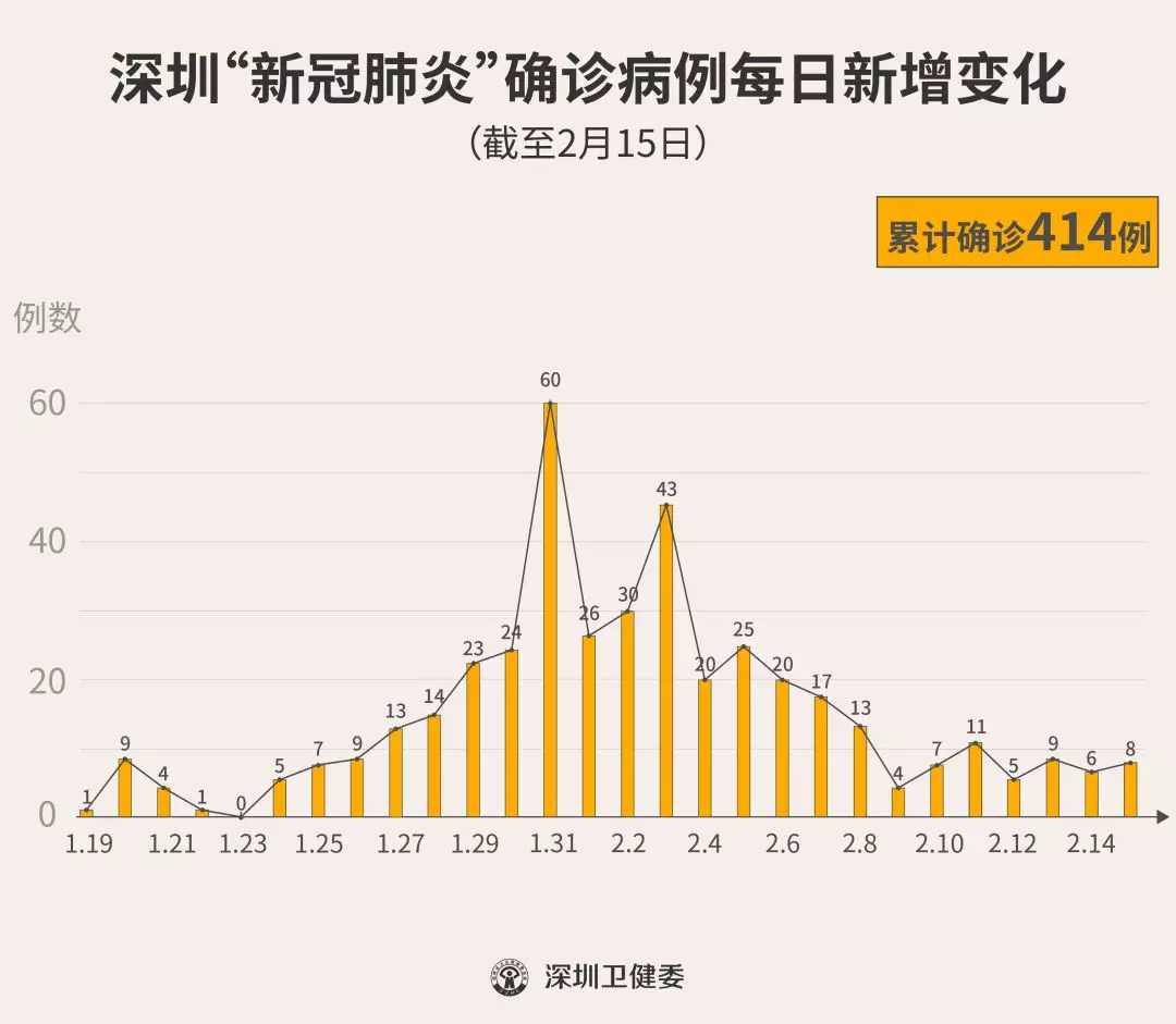 截至2月15日24時,深圳累計報告“新冠肺炎”確診病例414例。2月15日當天全市新增確診病例8例(個案詳情今晚公布)。 ▲新增出院病例已超過新增確診病例 累計報告確診病例中,男性195例、女性219例。 按照病例管理地區(qū)劃分,南山區(qū)87例、福田區(qū)78例、龍崗區(qū)71例、寶安區(qū)62例、龍華區(qū)34例、羅湖區(qū)32例、光明區(qū)11例、坪山區(qū)7例、鹽田區(qū)6例、大鵬新區(qū)2例、其他(指由機場、車站、碼頭、關(guān)口、路卡等直接送往定點醫(yī)院的)24例。 目前,重癥29例、危重癥9例,無死亡病例,累計出院115例。 299例確診病例均在深圳市第三人民醫(yī)院隔離治療。 541例密切接觸者正在接受醫(yī)學觀察。 資料來源:深圳市疾控中心、深圳市衛(wèi)健委、廣東省衛(wèi)健委