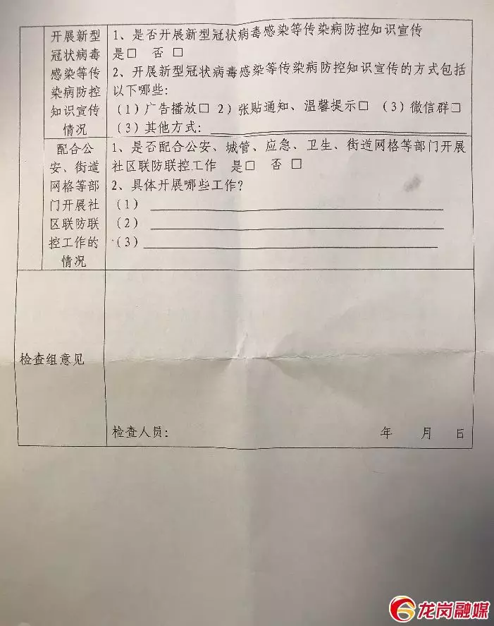 A:區(qū)住建局11組檢查人員都手握一張《龍崗區(qū)物業(yè)服務企業(yè)新型冠狀病毒防控工作檢查表》,其中按照“物業(yè)服務企業(yè)對企業(yè)從業(yè)人員的疫情防控情況”“口罩、手套等一次性衛(wèi)生用品專用垃圾桶的設(shè)置情況”“物業(yè)服務企業(yè)防疫責任落實情況”“開展新型冠狀病毒感染等傳染病防控知識宣傳情況”“配合公安、街道網(wǎng)格等部門開展社區(qū)聯(lián)防聯(lián)控工作情況”等五大類17條檢查內(nèi)容展開檢查,視情況評定“紅榜”或“黑榜”。