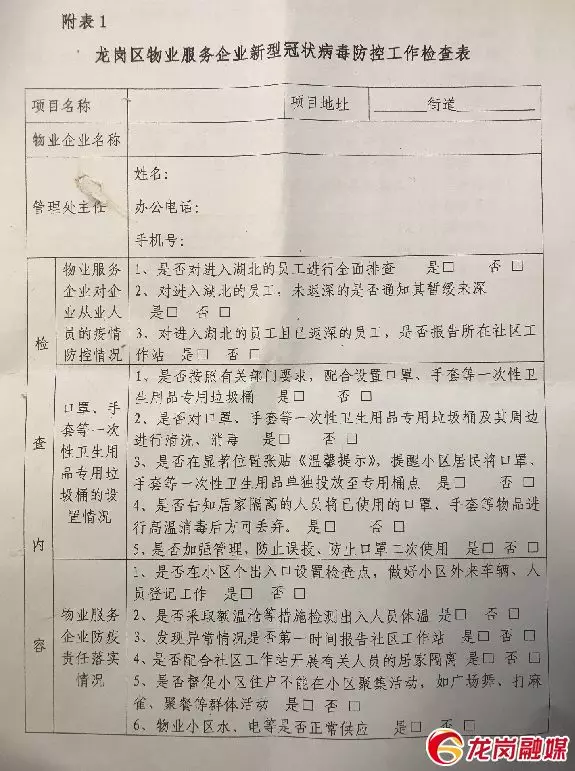 龍崗區(qū)物業(yè)服務企業(yè)新型冠狀病毒防控工作檢查表。