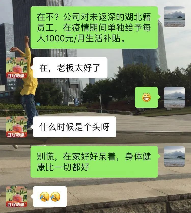 “無論多久,公司都會等他們回來,并按時發(fā)放工資和1000元生活補貼?!鄙钲谑欣ず胗铡⑸钲谑欣ず肟萍脊径麻L戴勤說,至今共有21名湖北籍員工,無法返回深圳上班。因此,公司除了正常為他們發(fā)放工資外,還額外給予他們每人每月1000元的生活補貼。