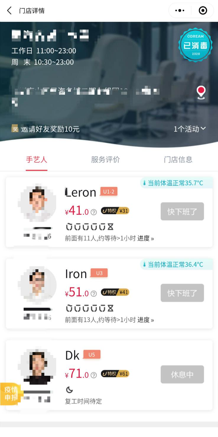 ▲通過線上平臺,顧客可以清晰了解門店消毒情況及理發(fā)師個(gè)人體溫。