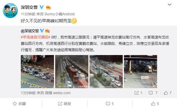 久違的早高峰回來(lái)了!“@深圳交警”早上8時(shí)許發(fā)布早高峰路況播報(bào),8時(shí),我市高速公路路況:清平高速神龍收費(fèi)站南行方向、水官高速布龍收費(fèi)站西行方向、機(jī)荷高速西行分別在黃鶴收費(fèi)站、水朗路段、秀峰立交,排榜立交呈現(xiàn)車多緩行情況。