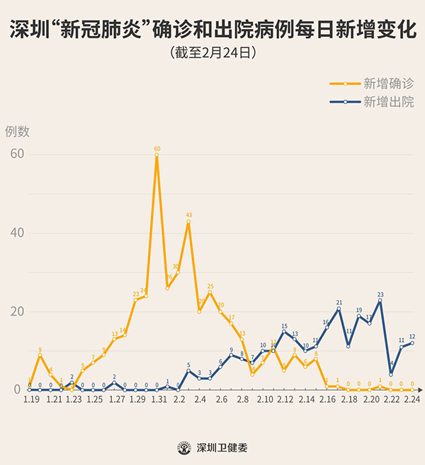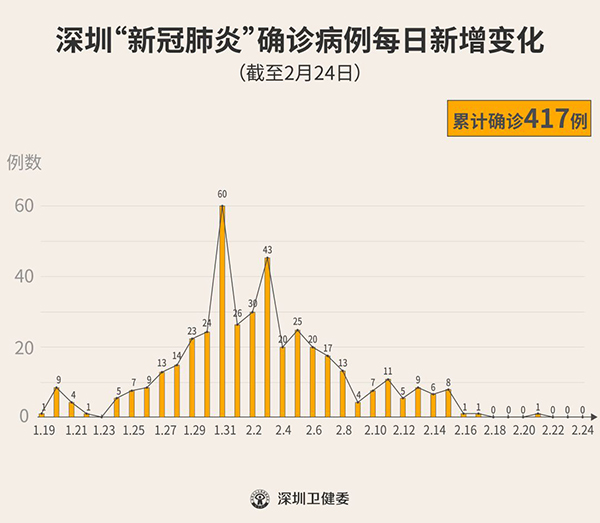 截至2月24日24時(shí),深圳累計(jì)報(bào)告“新冠肺炎”確診病例417例。2月24日當(dāng)天全市無(wú)新增確診病例。