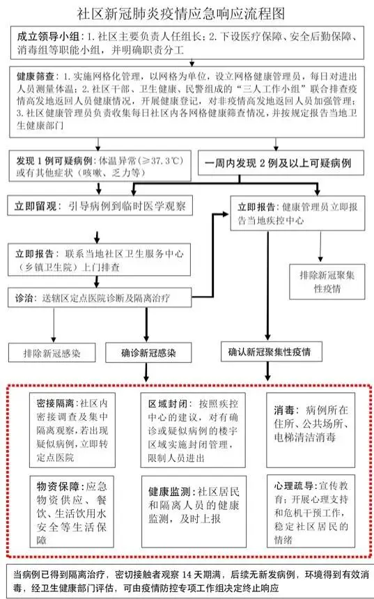一、成立疫情應(yīng)急領(lǐng)導(dǎo)小組,建立保障機(jī)制。社區(qū)及各有關(guān)單位成立主要負(fù)責(zé)人任領(lǐng)導(dǎo)小組組長的新冠肺炎疫情應(yīng)急領(lǐng)導(dǎo)小組,下設(shè)醫(yī)療保障、安全后勤保障、消毒組等職能小組,并明確職責(zé)分工。