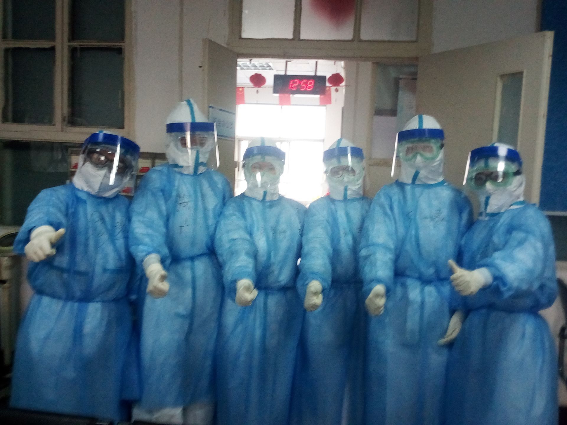 醫(yī)生團(tuán)隊(duì)共有7個(gè)人,我也將他們送到重癥隔離病區(qū)門口。我不能進(jìn)去,就和大家一起合了個(gè)影,這是我這一輩子都不能忘記的一次合影,我們每個(gè)人豎拳的手勢(shì)都那么有力,每個(gè)人的眼神都那么堅(jiān)定!連最瘦弱的女醫(yī)生單雪也看起來充滿力量。