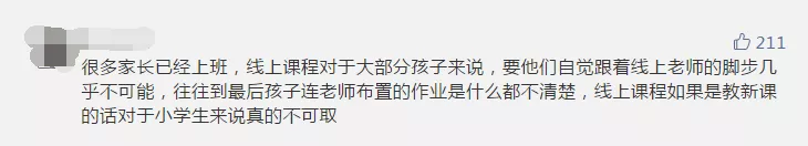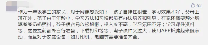 雖然網(wǎng)課兩端是老師和學(xué)生,但家長的參與也必不可少。部分參與者認為,如果沒有家長的有效監(jiān)管,網(wǎng)課很難保證教學(xué)質(zhì)量,而大部分家長已經(jīng)復(fù)工,無法時刻盯著孩子。有些家長晚上下班后還要監(jiān)督孩子上網(wǎng)課、做作業(yè),實在“費時、費力、費神”。讓孩子自己上網(wǎng)課,有些“連作業(yè)是什么都不清楚”。還有些孩子利用上網(wǎng)課的空檔玩游戲,甚至“從十七號開始到現(xiàn)在玩游戲超過1萬塊”。