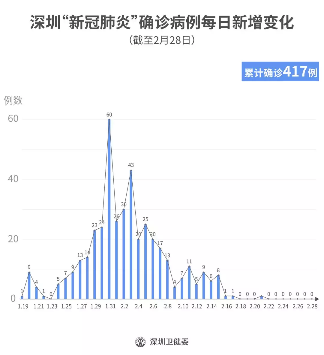 截至2月28日24時(shí),深圳累計(jì)報(bào)告“新冠肺炎”確診病例417例。2月28日當(dāng)天全市無(wú)新增確診病例,當(dāng)天出院病例18例(從26日起不再公布出院個(gè)案)。