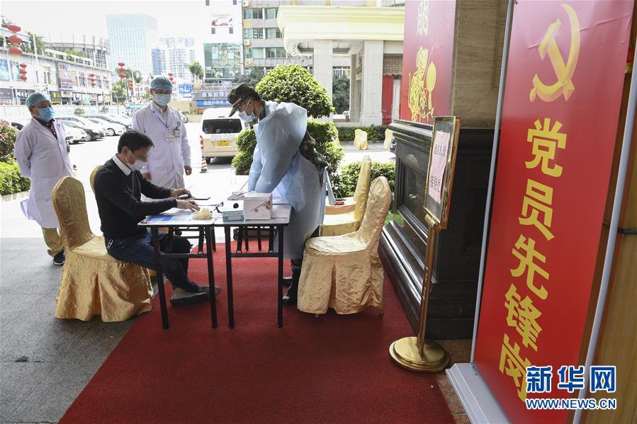 2月27日,深圳龍崗一家“健康驛站”的工作人員為重點疫區(qū)返回深圳的男子登記。