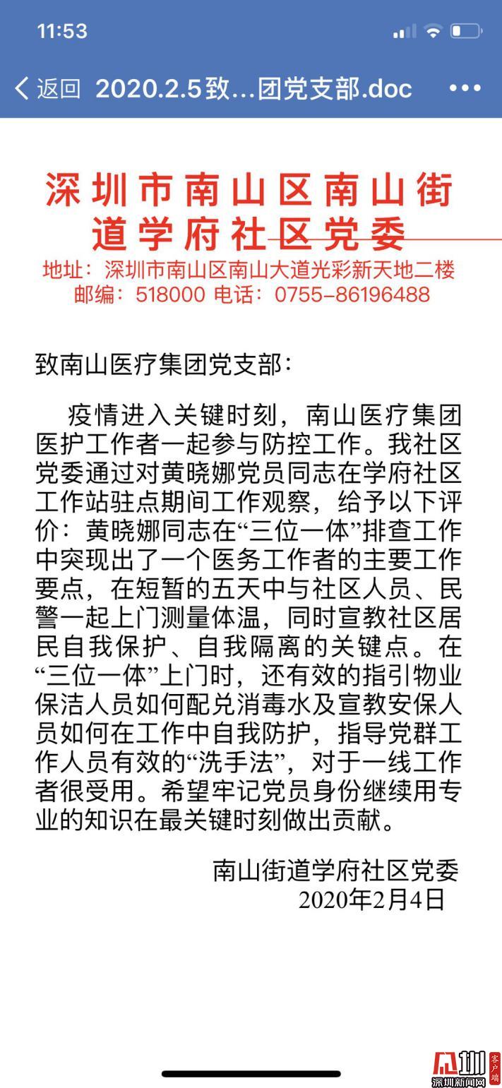 南山區(qū)南山街道學(xué)府社區(qū)黨委對(duì)黃曉娜的表?yè)P(yáng)信
