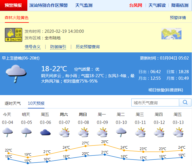 見圳客戶端·深圳新聞網(wǎng)2020年3月4日訊 深圳市氣象臺預(yù)計,4日我市陰天間多云有小雨,氣溫18-22℃,東風(fēng)3-4級,夜間起沿海和高地有7-8級陣風(fēng);5日小雨局部中雨,伴有零散雷暴,明顯轉(zhuǎn)涼;6日偶有分散小雨;7日起轉(zhuǎn)多云,氣溫回升。