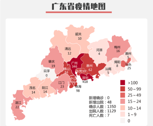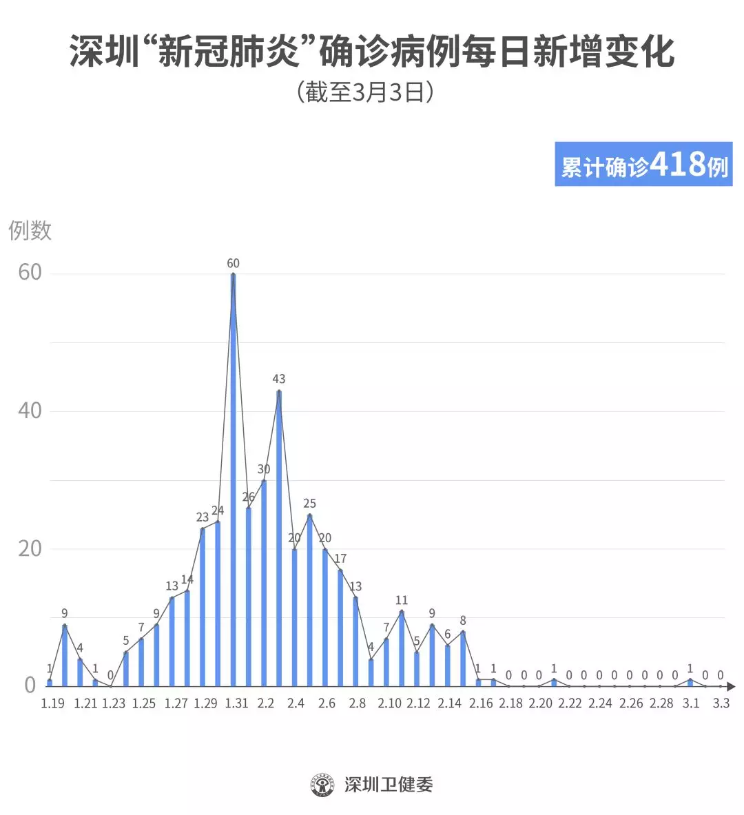 截至3月3日24時,深圳累計報告“新冠肺炎”確診病例418例。3月3日當天全市無新增確診病例,當天出院病例9例(從2月26日起不再公布出院個案)。
