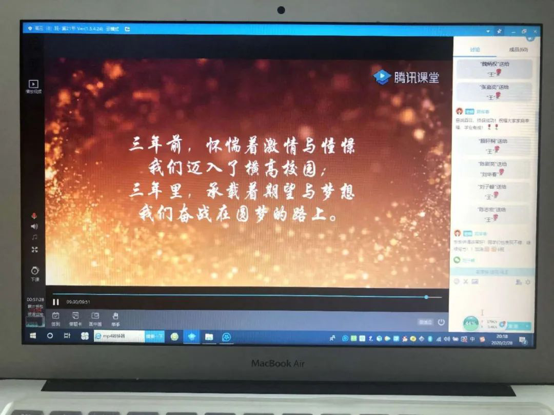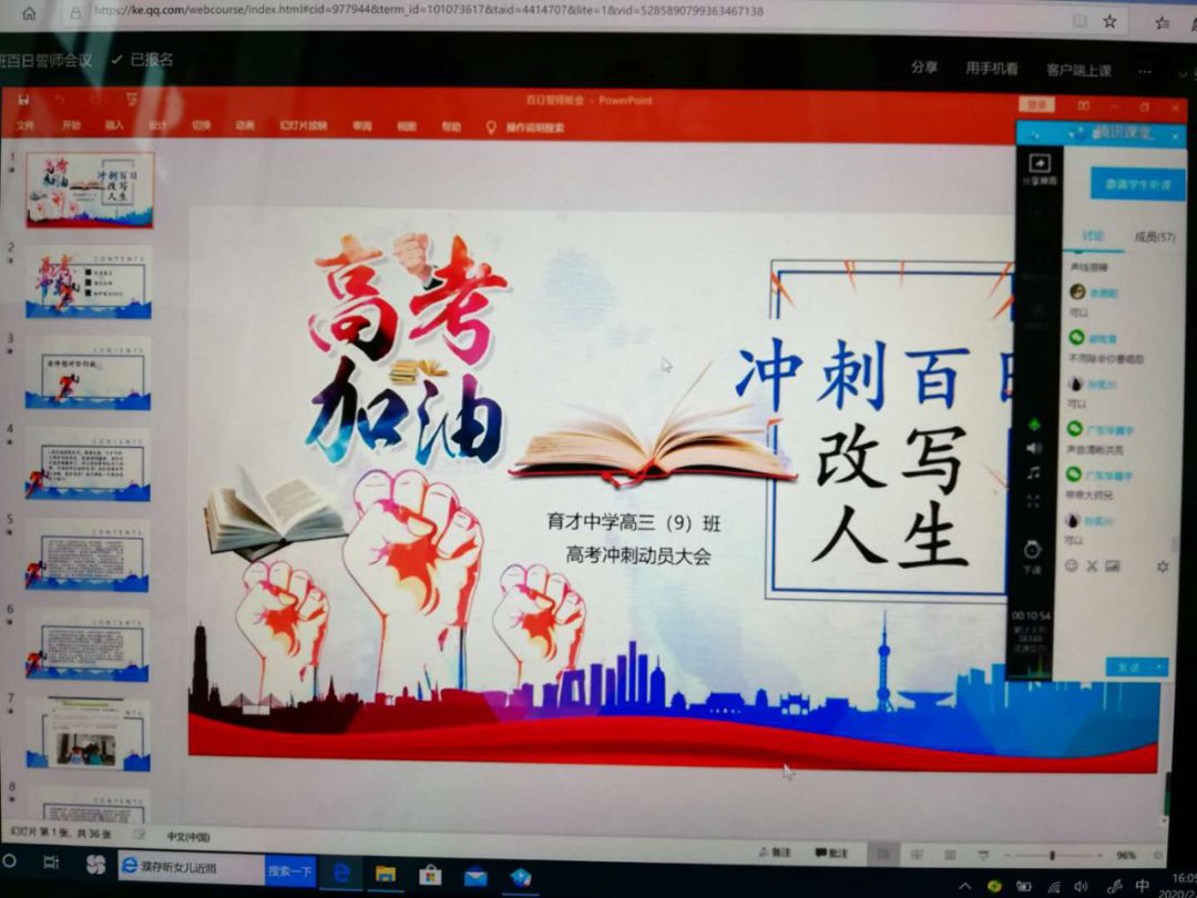 2月28日,橫崗高級中學(xué)2020屆高三全體師生利用騰訊課堂召開以班級為單位的網(wǎng)上“高考百日誓師大會”。各班精心制作PPT,提前錄制老師、家長、同學(xué)的祝福小視頻,科任老師、學(xué)生家長、學(xué)生代表連麥鼓勵(lì),同學(xué)們最后對著電子屏幕高喊百日誓詞同時(shí)下定決心,為自己的夢想,刻苦拼搏,永不言悔。網(wǎng)上“百日誓師”豪情滿懷、溫情涌動(dòng)、感人至深。