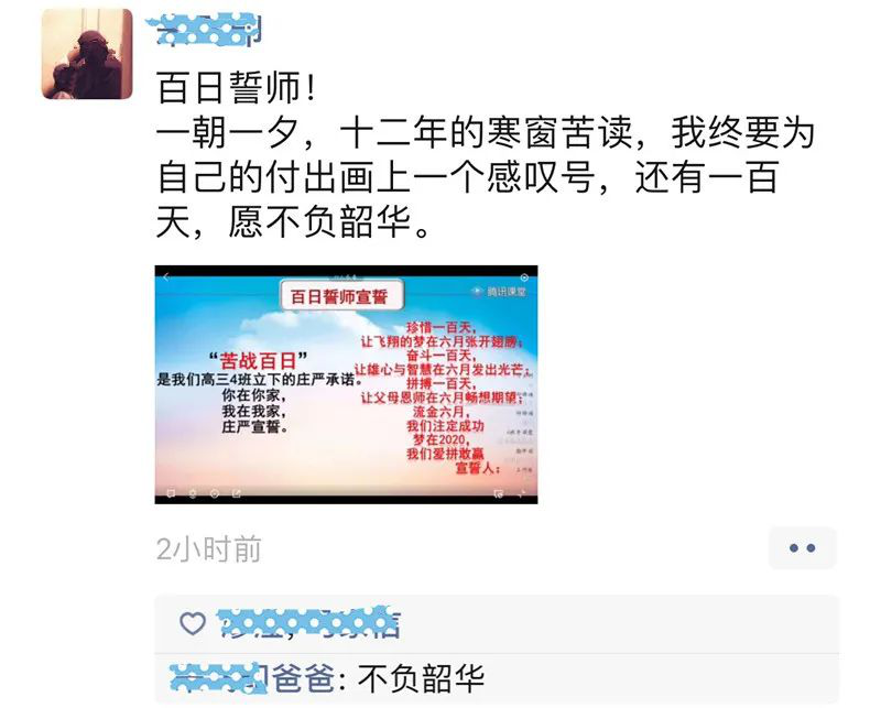 高三(10)班劉欣頤媽媽的留言也贏得了孩子們點(diǎn)贊:“親愛的孩子們,在這最苦難時(shí)期,請堅(jiān)持你們的奮斗目標(biāo)和理想,不要退縮、勇往直前。許多事情,堅(jiān)持堅(jiān)持就過來了。人生就是一場修行,再苦再累,只要朝著自己努力的奮斗目標(biāo),屬于你的終究會出現(xiàn)。不負(fù)韶華方得始終,夢想永遠(yuǎn)屬于努力奮斗的人。加油吧,少年!”