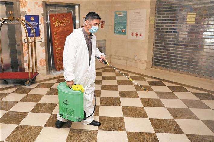 ▲工作人員對酒店大堂進(jìn)行消毒。深圳晚報(bào)記者楊少昆攝