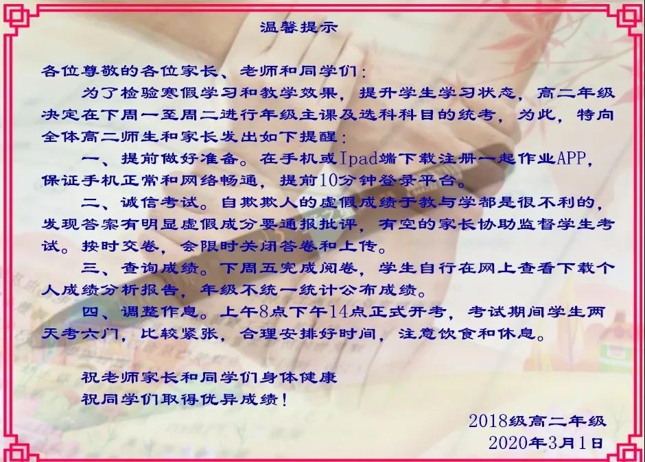 為了提高考試的可信度,考前各班級還進行了誠信教育,讓學生明白誠信考試的重要性以及自欺欺人的危害,并發(fā)動居家的家長積極配合監(jiān)考??记?,學校也向老師學生和家長發(fā)了提示,提醒網(wǎng)上考試注意事項。