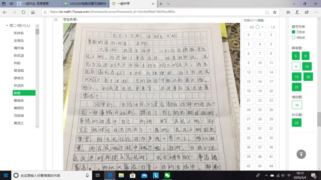 早在網(wǎng)課開始第二周,針對老師們對網(wǎng)課效率不高的顧慮,高二年級就做了一次網(wǎng)上調(diào)查,絕大部分老師贊成進行一次網(wǎng)上考試,以檢驗網(wǎng)課的學習效果,以便調(diào)整教學。之后,學校開始著手準備網(wǎng)上考試,向技術平臺提交學生和老師信息,下發(fā)《一起作業(yè)學生注冊登錄指引》和《一起作業(yè)教師作業(yè)批改操作指南》。年級各備課組開始命題,為了檢驗二實“線上學堂”的實效,學校要求命題的范圍以直播課內(nèi)容為主,兼顧寒假作業(yè)??记耙恢埽鱾湔n組都上交平臺進行試卷制作。2月26日,網(wǎng)上作業(yè)批改功能正式上線,高二年級要求備課組在考試之前至少利用線上平臺布置批改一次網(wǎng)上作業(yè),積累經(jīng)驗,提醒平臺改進不完善的問題,及時更新,同時讓學生和老師熟悉操作技巧。備課組在考前都向?qū)W生發(fā)布了考試注意事項,要求學生豎拍照片,注意字跡大小和拍照清晰度,單題上傳,試卷在閱讀頁面和題目設置也做了優(yōu)化,大大方便了學生答題,有效減輕老師改卷負擔,提高了閱卷的效率。