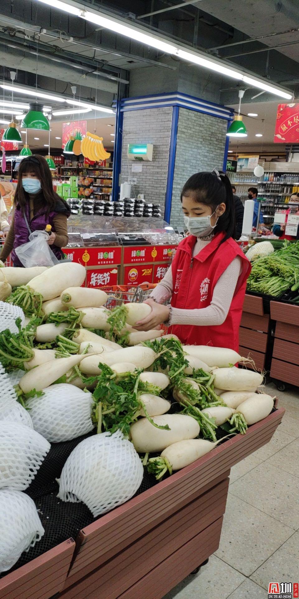 隨著疫情發(fā)生,春節(jié)期間待在深圳的露茜隨媽媽投身到了防疫一線,從事食品藥品安全志愿服務(wù)工作。在商場維持秩序,為市民挑揀蔬菜,成為了顧客眼中“別人家的孩子”。