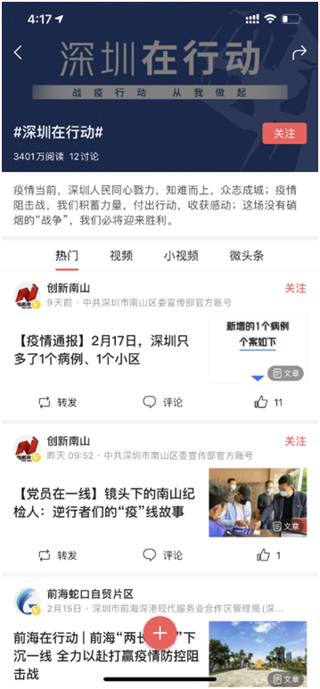 今日頭條話題#全民共抗肺炎深圳在行動(dòng)#共計(jì)3401萬閱讀量,文章參與數(shù)130余篇。