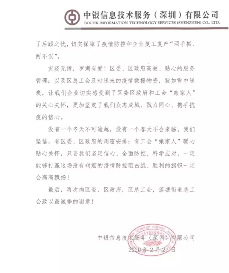 中銀信息技術(shù)服務(wù)(深圳)有限公司、銘基食品有限公司在復(fù)工復(fù)產(chǎn)后都遇到了一些困難,羅湖工會(huì)了解了他們的情況后,主動(dòng)發(fā)揮工會(huì)作用,幫企業(yè)解決困難,協(xié)助他們順利復(fù)工復(fù)產(chǎn)。近日,兩封感謝信送到了羅湖區(qū)委、區(qū)政府,向羅湖羅湖區(qū)委、區(qū)政府以及羅湖各級(jí)工會(huì)為企業(yè)的付出表示感謝。