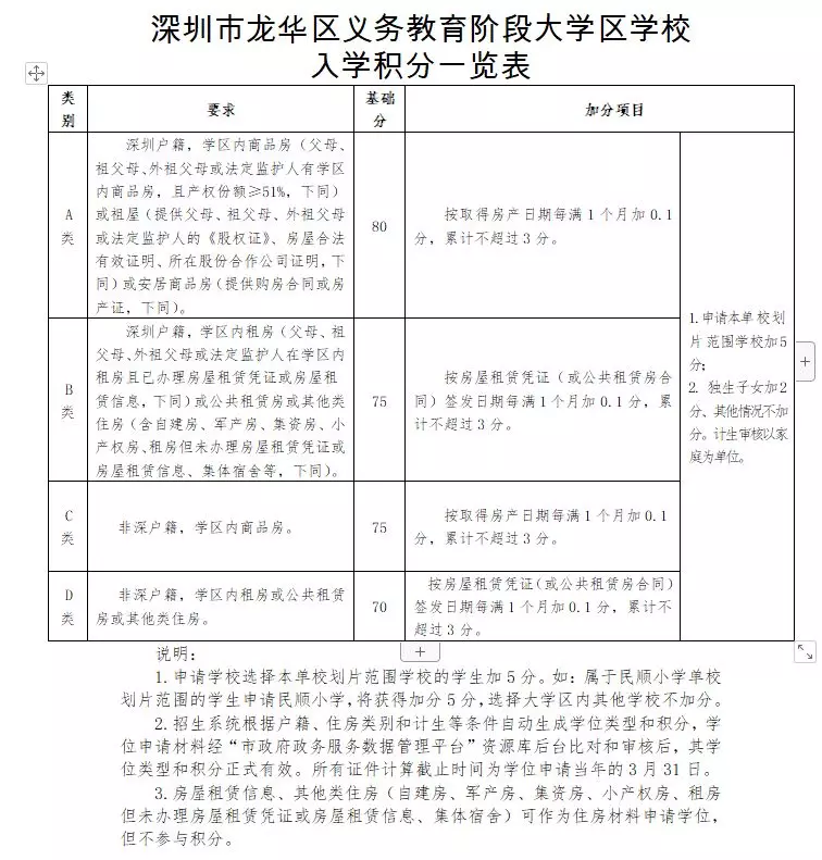 深圳戶籍。申請入學(xué)適齡兒童、少年的父母(或法定監(jiān)護(hù)人)戶籍遷入深圳時(shí)間最長的一方計(jì)算積分,每滿一個(gè)月加0.1分。