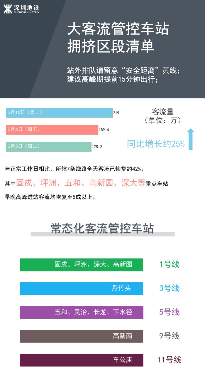 截至3月10日(周二),深圳地鐵所轄7條線路已有26座車站在高峰期出現(xiàn)較大客流。