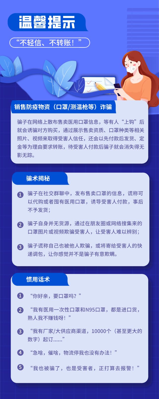 “我來(lái)報(bào)警!群里有人騙我口罩錢(qián)!” 3月4日,事主李小姐匆匆來(lái)到深圳市公安局福田分局香蜜湖派出所報(bào)案并講述了自己被騙的經(jīng)過(guò)。 此前李小姐在某社區(qū)賣(mài)菜群里,看到了一名群友發(fā)布“口罩資源”的信息,于是加其為好友,對(duì)方向李小姐展示了售賣(mài)資質(zhì)以及售賣(mài)口罩的樣品,一步步讓李小姐放松了警惕,雙方以1.75元/個(gè)醫(yī)用口罩、9元/個(gè)N94口罩的價(jià)格談妥交易。 隨后李小姐通過(guò)轉(zhuǎn)賬先向?qū)Ψ劫?gòu)買(mǎi)了一批口罩。李小姐覺(jué)得對(duì)方還挺靠譜的,就又分四次向?qū)Ψ睫D(zhuǎn)賬,分別郵寄給自己不同的朋友,累計(jì)向?qū)Ψ睫D(zhuǎn)賬了990元。 不料所有的錢(qián)轉(zhuǎn)過(guò)去之后,這個(gè)群友卻消失了,發(fā)信息不回,打視頻不接,雖未拉黑但也沒(méi)任何回應(yīng)。“十分氣人,被騙的錢(qián)雖然不多,但是一定要給詐騙分子嚴(yán)懲!”李小姐對(duì)民警這樣講述道。 民生小案無(wú)小事,數(shù)百元現(xiàn)金被騙,電單車(chē)被盜……這些看似平常的一件件“小”案,背后牽連的卻是廣大群眾的幸福感、安全感。 香蜜湖派出所民警聚力破小案,服務(wù)大民生,做到有案必偵,快偵快破。經(jīng)多方面調(diào)查后,最終確定了嫌疑人的身份——游某。3月9日11時(shí)許,福田警方將嫌疑人游某抓獲。 ▲嫌疑人通過(guò)網(wǎng)絡(luò)發(fā)布虛假信息進(jìn)行詐騙 據(jù)了解,游某于2019年下半年來(lái)到深圳,此前加入了一個(gè)社區(qū)賣(mài)菜群。不久前,游某因手頭緊,于是就在群里發(fā)布消息,謊稱自己有大量口罩待出售。 游某在群里發(fā)布買(mǎi)賣(mài)“口罩”信息,會(huì)不會(huì)還有其他的受害者?這是民警第一時(shí)間的直覺(jué)。隨著調(diào)查的深入,民警發(fā)現(xiàn)還有其他受害者與游某聯(lián)系購(gòu)買(mǎi)“口罩”及多筆手機(jī)轉(zhuǎn)賬記錄,金額雖然不大,大多為80元、100元、115元、175元……各個(gè)個(gè)案的涉案金額看起來(lái)都是“小錢(qián)”,但我們的民警還是盡心盡力,絲毫沒(méi)有放松,一項(xiàng)項(xiàng)認(rèn)真核實(shí)并一一做好記錄。 據(jù)初步統(tǒng)計(jì),從1月30日至今,游某通過(guò)向他人售賣(mài)口罩實(shí)施詐騙,累計(jì)詐騙4000余元,被騙的受害人多達(dá)16人! ▲民警抓獲嫌疑人 現(xiàn)游某對(duì)利用網(wǎng)絡(luò)實(shí)施口罩詐騙的行為供認(rèn)不諱,已被警方依法刑事拘留,在香蜜湖派出所民警的聯(lián)系下,目前已有受害群友相繼前來(lái)協(xié)助調(diào)查,案件仍在進(jìn)一步調(diào)查中。 ▲民警審訊嫌疑人 警言警語(yǔ) 香蜜湖派出所 民警鄭卓 疫情期間,不少企業(yè)和個(gè)人紛紛采購(gòu)口罩等防護(hù)用品。針對(duì)利用口罩等防疫物資實(shí)施詐騙等違法犯罪行為的不法分子,福田警方堅(jiān)決從嚴(yán)從快依法打擊。廣大市民謹(jǐn)記,購(gòu)買(mǎi)口罩、消毒液等防疫物資,要通過(guò)正規(guī)途徑,做到“不輕信、不轉(zhuǎn)賬”,避免上當(dāng)受騙。