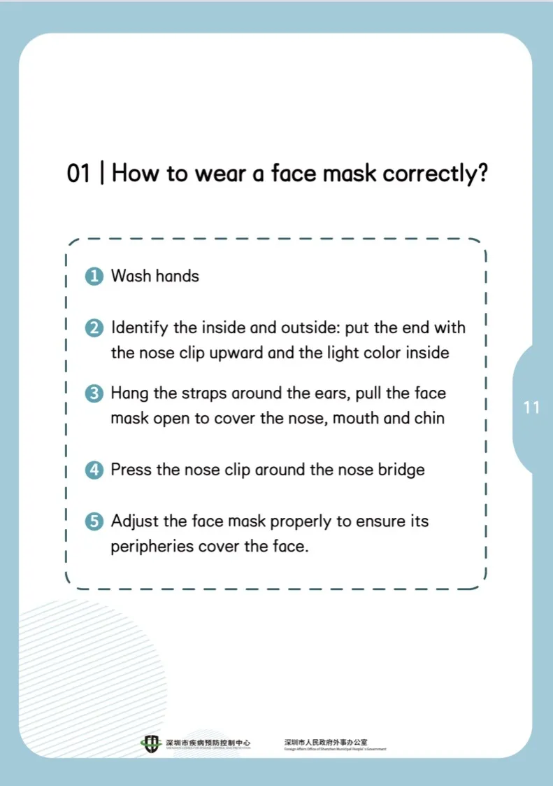 首先洗手——確認內(nèi)外:有鼻夾的一端朝上,淺色一面朝自己——將掛繩繞在耳朵上,拉開口罩,把鼻、口、下巴罩好——把鼻夾沿鼻梁處貼緊——適當調(diào)整口罩,使口罩周邊充分貼合面部。
