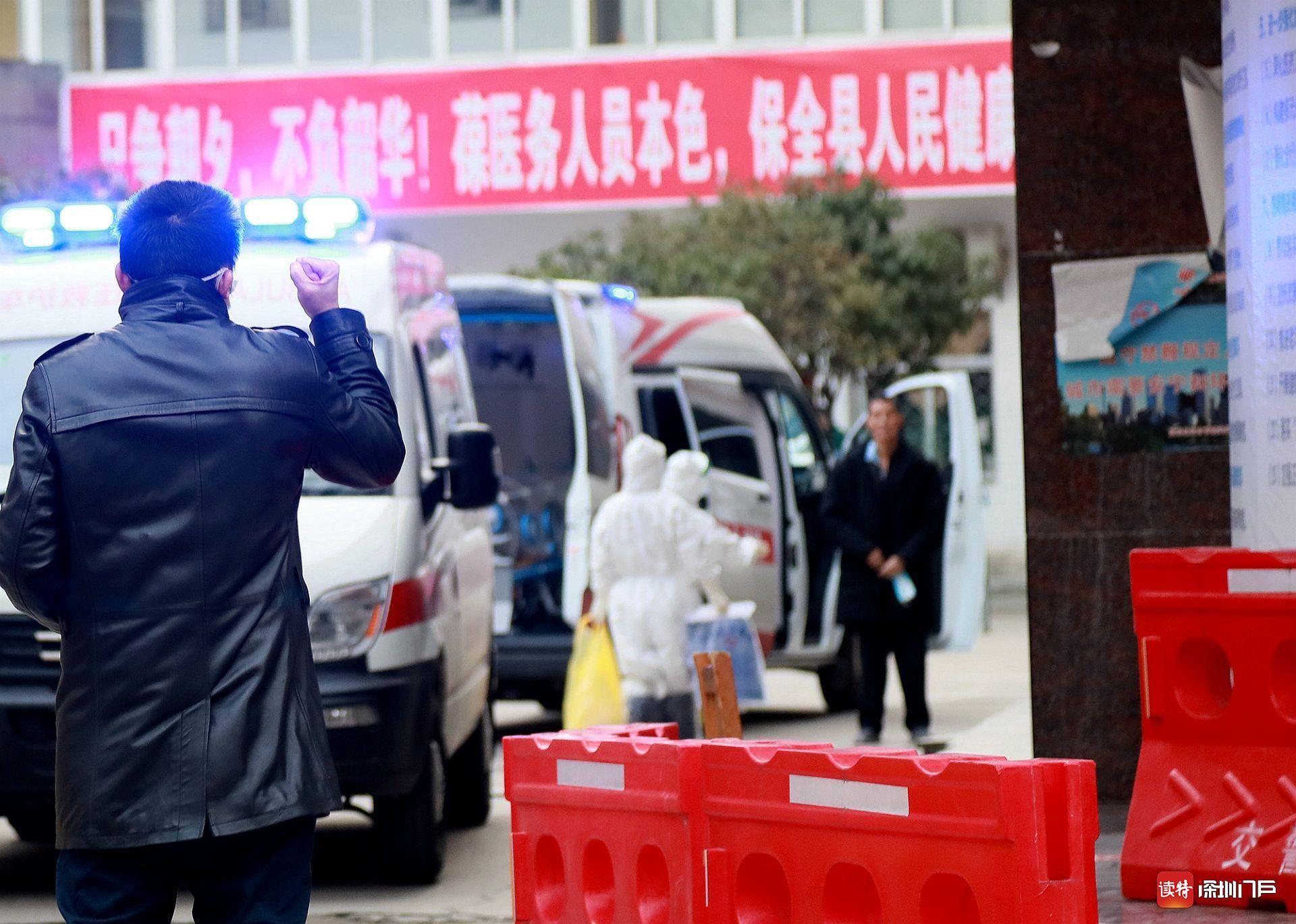 2月29日,監(jiān)利縣中醫(yī)院,一位重癥患者即將轉往荊州救治。患者的兒子聞訊趕來,遠遠地向父親舉起拳頭,高喊“加油”。