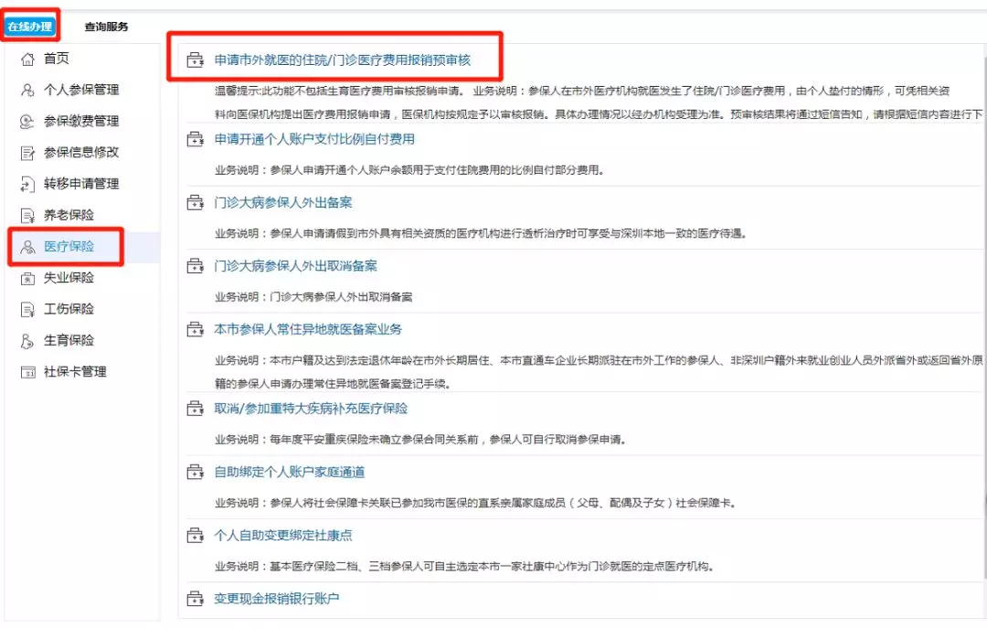 點擊“在線辦理”→點擊“醫(yī)療保險”→點擊“申請市外就醫(yī)的住院/門診費用報銷預審核”