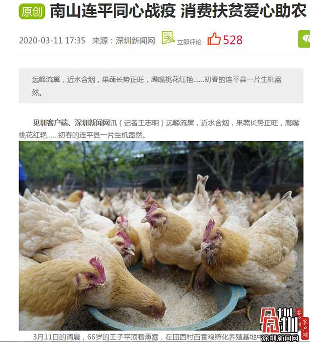 今年新冠肺炎疫情發(fā)生以后,南連農(nóng)業(yè)對(duì)口幫扶的河源連平四個(gè)基地受到影響,共有近2萬(wàn)只百香雞待銷(xiāo),其中連平縣田源鎮(zhèn)田西村基地的6000多只百香雞無(wú)人問(wèn)津。就在村民一籌莫展的時(shí)候,深圳新聞網(wǎng)等媒體知曉后,迅速進(jìn)行深度采訪,3月11日刊發(fā)了《南山連平同心戰(zhàn)疫 消費(fèi)扶貧愛(ài)心助農(nóng)》的報(bào)道,呼吁深圳的企事業(yè)單位以及愛(ài)心市民,通過(guò)“以購(gòu)代捐”“以買(mǎi)代幫”的方式參與消費(fèi)扶貧,幫助連平農(nóng)戶們渡過(guò)難關(guān)。
