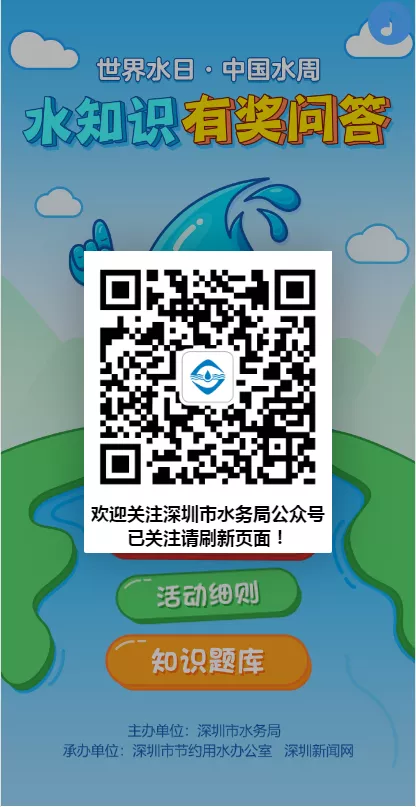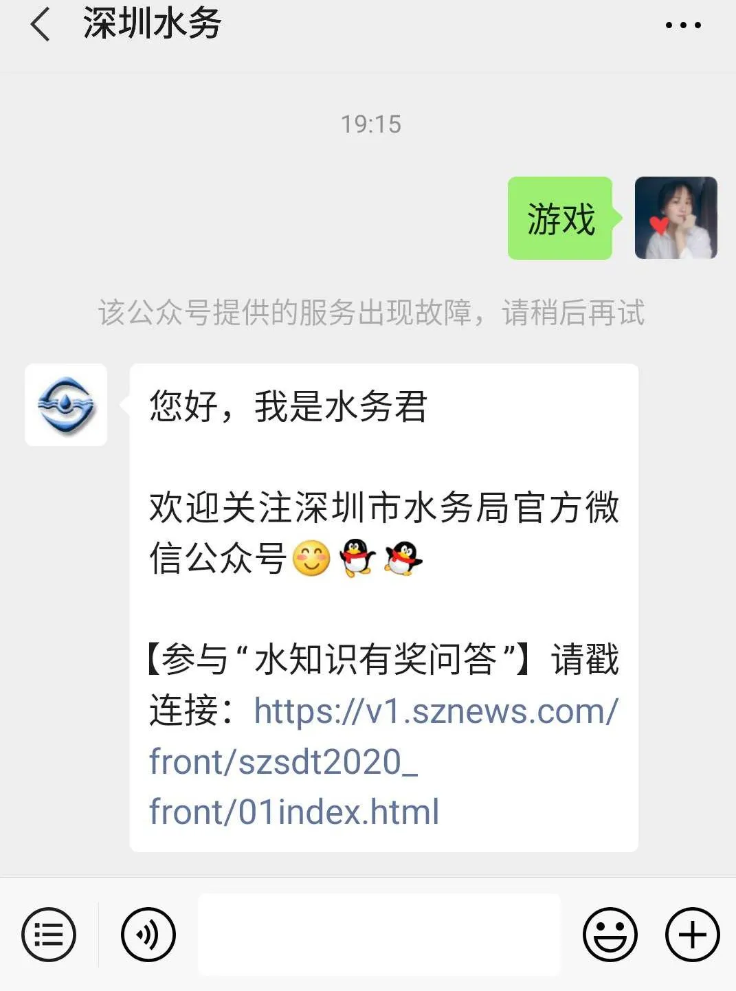 如果您已經關注了“深圳水務”,可以在公眾號留言欄輸入“游戲”、“答題”“紅包”等關鍵詞哦。