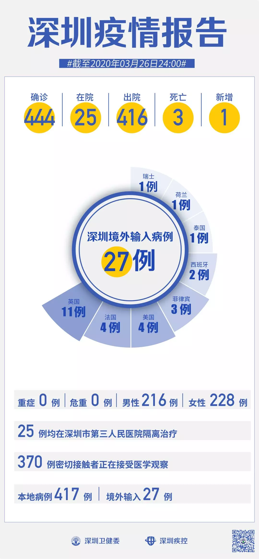 截至3月26日24時(shí),深圳累計(jì)報(bào)告“新冠肺炎”病例444例。3月26日當(dāng)天新增1例,出院1例。
