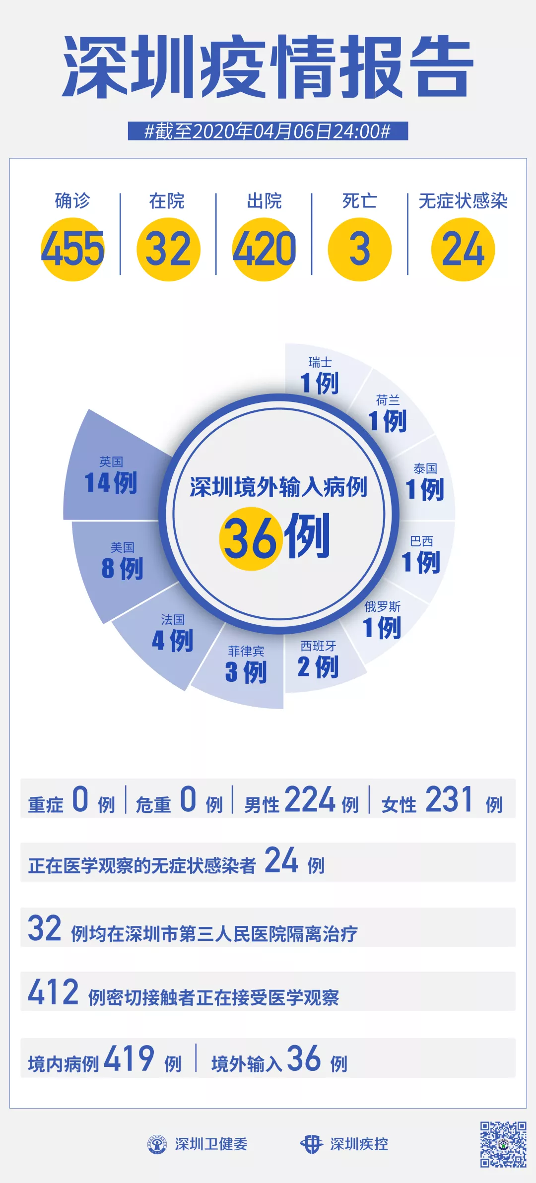 截至4月6日24時(shí),深圳累計(jì)報(bào)告新冠肺炎病例455例。4月6日當(dāng)天新增無癥狀感染者1例。