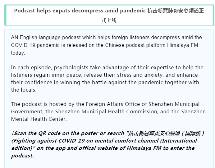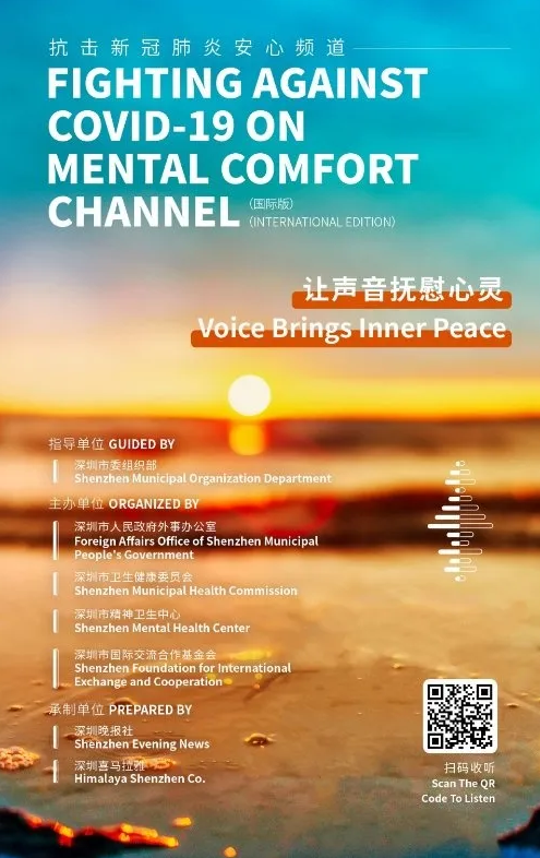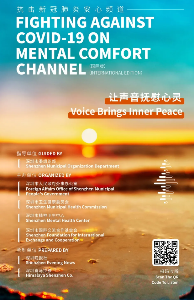 在疫情面前,每一份信念都意義重大,每一個希望都影響深遠。4月11日,抗擊新冠肺炎安心頻道(國際版)在喜馬拉雅 APP正式上線。該欄目在深圳市委組織部的指導下,由深圳市外辦攜手深圳市衛(wèi)健委、深圳市精神衛(wèi)生中心、深圳市國際交流合作基金會聯(lián)合出品,由深圳晚報和深圳喜馬拉雅共同承制。據悉,抗擊新冠肺炎安心頻道(國際版)是深圳市外辦首次聯(lián)合多部門協(xié)作,共同出品的全英文音頻欄目,也是繼"抗擊新型肺炎安心手冊音頻版"推出以來的又一大創(chuàng)新。該欄目的推出體現(xiàn)了深圳對中外居民的人文關懷,也展現(xiàn)了深圳作為國際化城市的溫暖大愛。