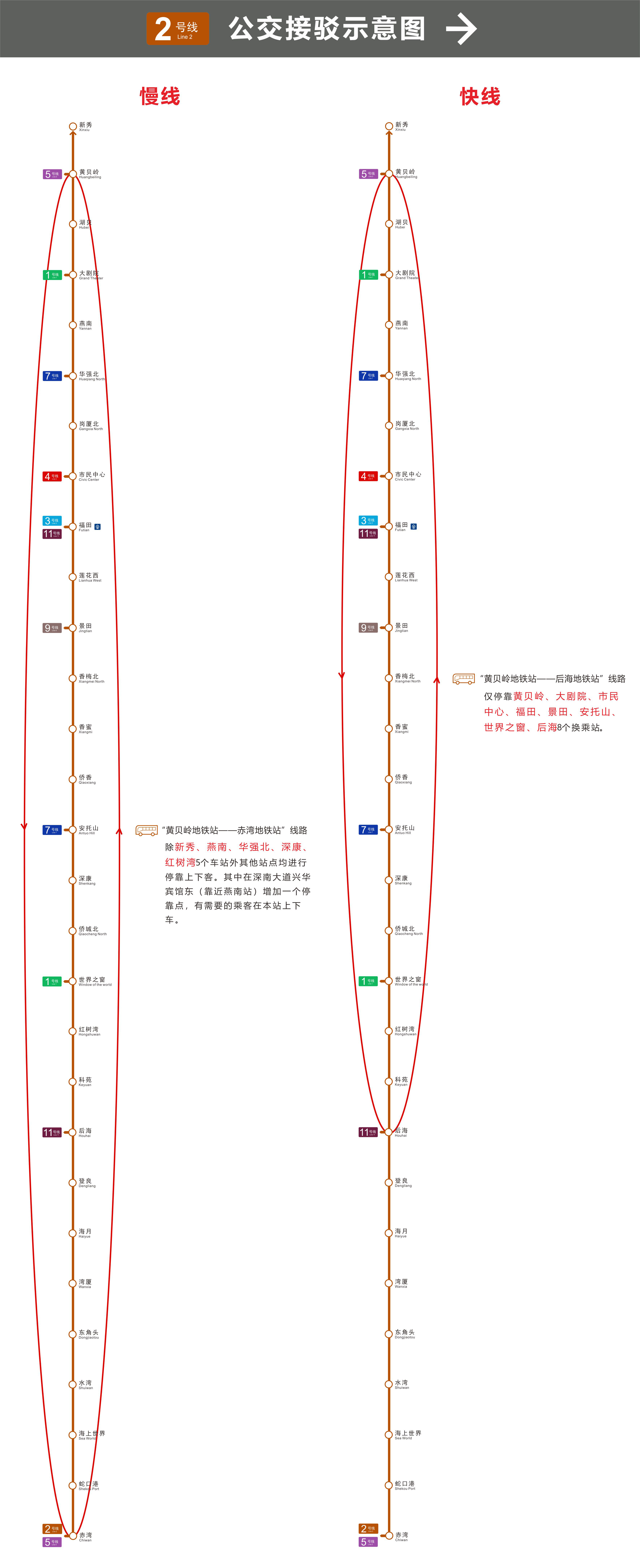 為了方便期間市民乘客的出行,屆時將組織循環(huán)開行2號線的兩條公交接駁線路。1、公交接駁慢線:“黃貝嶺站—赤灣站”。除新秀、燕南、華強(qiáng)北、深康、紅樹灣5個站點(diǎn)不??恐?,其余各站均??可舷驴?。2、公交接駁快線:“黃貝嶺站—后海站”。僅??奎S貝嶺、大劇院、市民中心、福田、景田、安托山、世界之窗、后海共8個換乘站。