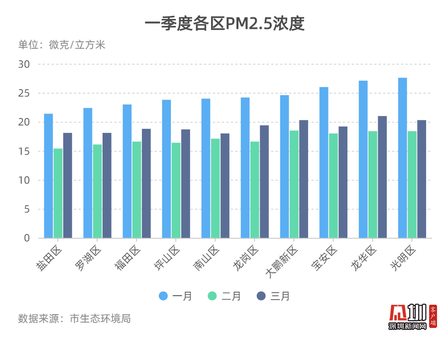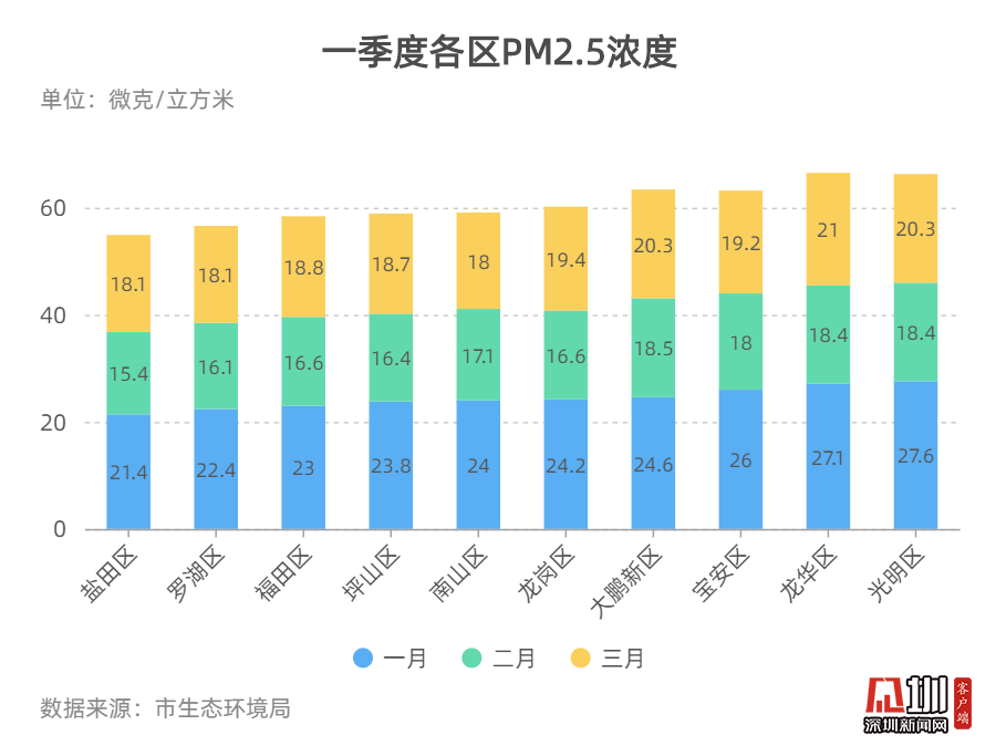 2020年一季度整體數(shù)據(jù)顯示,各區(qū)一月份的PM2.5濃度數(shù)值相對(duì)較高,二月份均有所下降,三月份數(shù)值又有所回調(diào)。羅湖區(qū)和鹽田區(qū)空氣質(zhì)量排名連續(xù)位列三甲,而光明區(qū)空氣質(zhì)量排名連續(xù)位于末端。