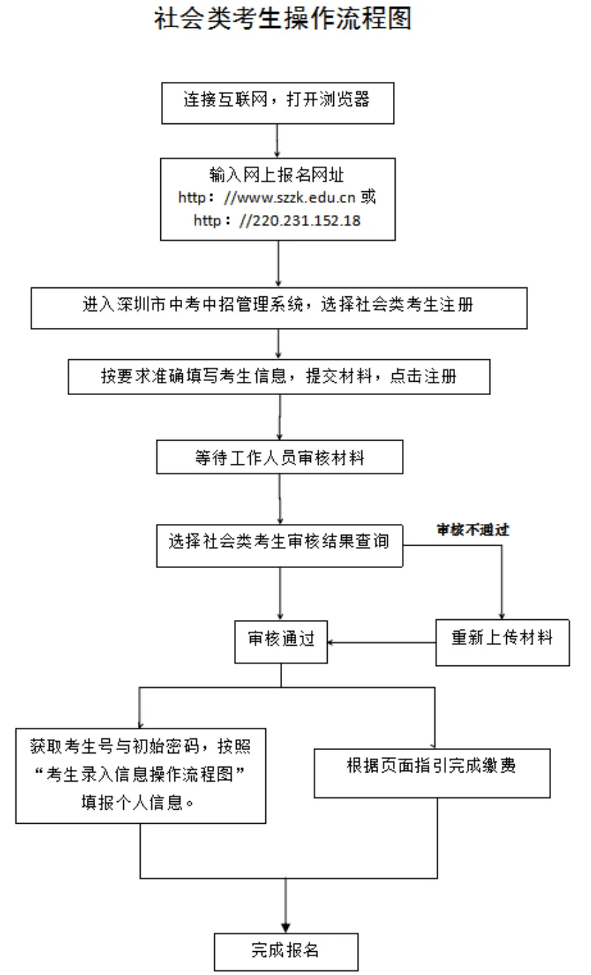 見圳客戶端·深圳新聞網(wǎng)2020年4月30日訊 據(jù)深圳市教育局消息,2020年深圳高中階段學(xué)校招生考試(以下簡稱“中考”)報名定于5月6日-15日進(jìn)行,考試時間為7月20日-21日。 今年本市應(yīng)屆初中畢業(yè)生仍繼續(xù)在就讀學(xué)校集體辦理報名手續(xù)。符合深圳中考報名條件的深圳戶籍往屆生、在市外就讀的深圳戶籍應(yīng)屆初中畢業(yè)生(以下簡稱“社會類考生”)采用網(wǎng)上報名方式進(jìn)行報名。 報名條件 一、具有我市戶籍的初中畢業(yè)生,可以在我市報名參加中考。 二、具有我市初三學(xué)籍的隨遷子女可以報名參加中考,同時符合以下條件的,可以參加相應(yīng)的公辦普高、民辦普高和中職學(xué)校的劃線錄取。 (一)父親或母親在我市具有合法穩(wěn)定職業(yè); (二)父親或母親在我市具有合法穩(wěn)定住所; (三)父親或母親持有有效《深圳經(jīng)濟(jì)特區(qū)居住證》; (四)父親或母親在我市繳納基本養(yǎng)老保險及基本醫(yī)療保險,且至少其中一個險種累計繳費滿3年,社保累計年限計算截至2020年8月31日; (五)隨遷子女在我市具有3年完整初中學(xué)籍。 不符合上述條件但具有我市初中學(xué)籍的隨遷子女,可以在我市參加中考,但僅限于參加民辦普高補(bǔ)錄或中職學(xué)校注冊入學(xué)。 三、高中階段學(xué)校在校生不得報名。 本市應(yīng)屆初中畢業(yè)生報名辦法 本市應(yīng)屆初中畢業(yè)生于5月6日至7日在就讀學(xué)校集體辦理報名手續(xù)。 今年中考繼續(xù)實行網(wǎng)上報名。要求各學(xué)校開放計算機(jī)房,為本??忌暇W(wǎng)報名提供方便。 5月8日至15日,學(xué)校組織考生進(jìn)行電子攝像,學(xué)校和考生分別上網(wǎng)錄入報名信息,考生錄入信息可參考“考生錄入信息流程圖”進(jìn)行操作。 市教育局強(qiáng)調(diào),學(xué)校不得以任何理由拒絕有本校學(xué)籍的應(yīng)屆畢業(yè)生報考(參加中職學(xué)校自主招生、注冊入學(xué)的考生,也須報名參加中考)。如有違反者,將嚴(yán)肅查處,并追究相關(guān)人員責(zé)任。同時要求各區(qū)有關(guān)職能部門、各有關(guān)學(xué)校(報名點)要嚴(yán)格審查報名材料。對不符合報名條件、弄虛作假而被錄取的考生,一經(jīng)發(fā)現(xiàn),取消其錄取資格;已經(jīng)到錄取學(xué)校報到注冊的,取消其學(xué)籍,并追究相關(guān)人員責(zé)任。 社會類考生報名辦法 社會類考生采用網(wǎng)上報名方式進(jìn)行報名。報名考生需在5月6日至15日登錄報名網(wǎng)址(http://www.szzk.edu.cn/),按照提示進(jìn)行網(wǎng)上注冊,上傳報名審核資料,由考生戶籍所在區(qū)社會報名點進(jìn)行線上審核,審核通過后系統(tǒng)將生成中考考生號及初始密碼,考生需用獲取的考號及密碼登錄中考中招管理系統(tǒng),填寫個人信息,具體操作可參考“考生錄入信息流程圖”。同時需在報名截止前根據(jù)指引完成網(wǎng)上繳費。 若考生網(wǎng)上報名審核不通過,需按照系統(tǒng)的不通過原因提示,重新補(bǔ)充審核資料,如多次上傳資料失敗或?qū)徍瞬煌ㄟ^,考生可撥打戶籍所在區(qū)的社會報名點電話進(jìn)行咨詢或電話預(yù)約,按照工作人員指示進(jìn)行操作報名,不要在未預(yù)約的情況下前往社會報名點,盡量避免出行,減少人員聚集。 社會類考生操作流程如下圖: