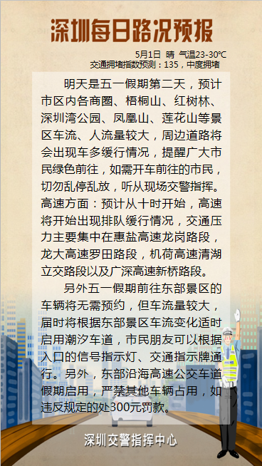 為了能度過(guò)一個(gè)不堵路也不堵心的假期,深圳交警建議大家錯(cuò)峰出行,深圳交警將密切監(jiān)測(cè)路面情況,市民在出行前可通過(guò)深圳交警微信、微博、交通廣播沿途交通誘導(dǎo)指示屏等方式獲取實(shí)時(shí)交通路況信息,合理規(guī)劃出行路線和時(shí)間,確保行車(chē)暢順。